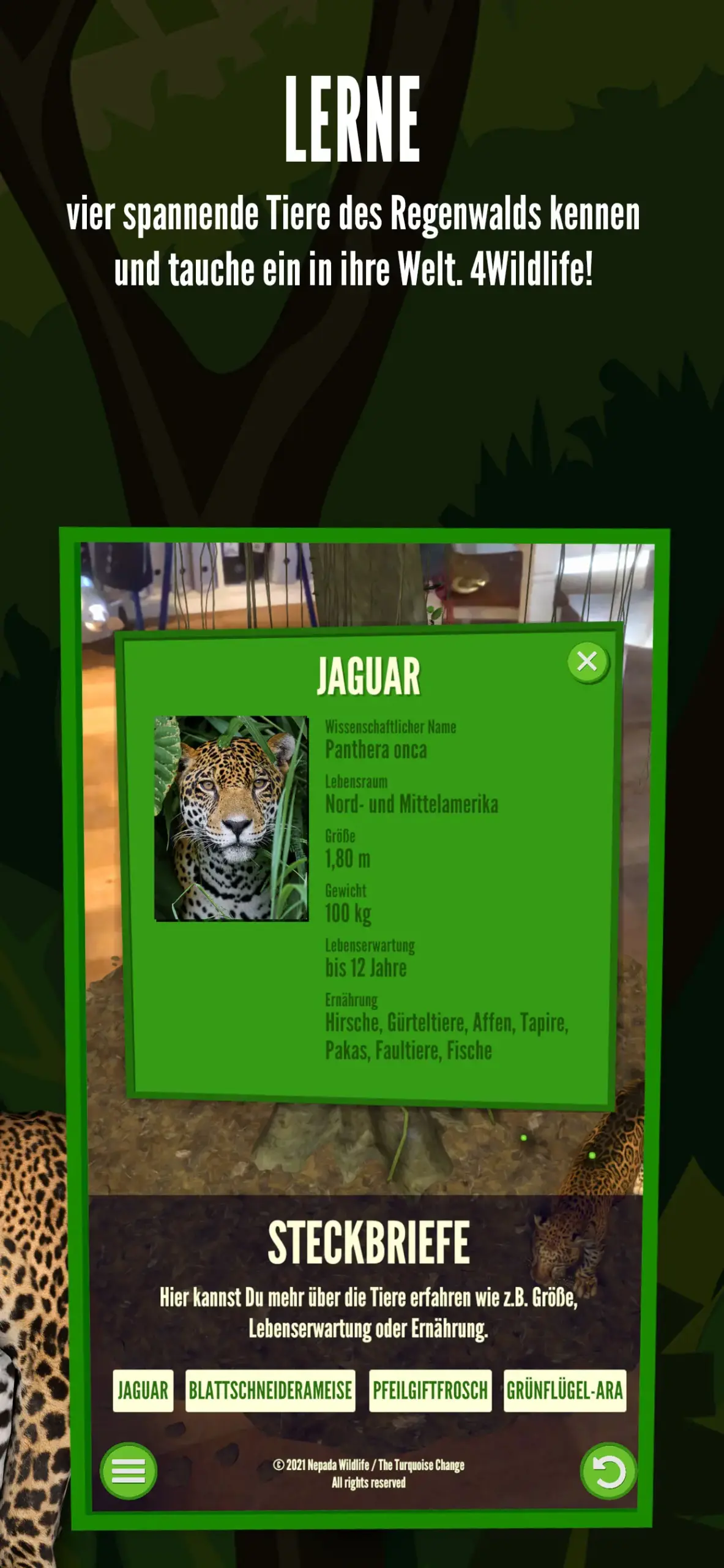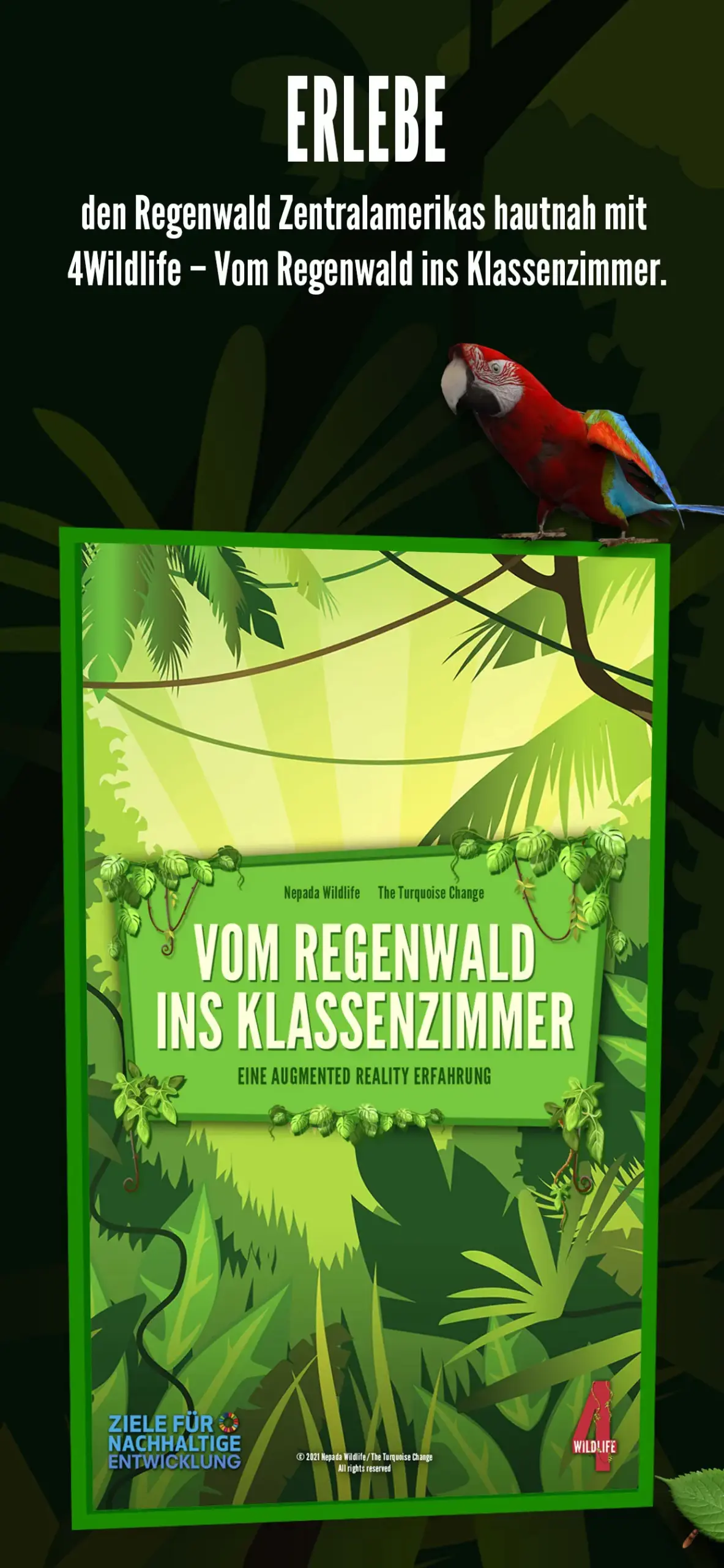 Erlebe den Regenwald hautnah: Mit dieser Augmented Reality App kannst du einen Baumriesen aus dem Dschungel Zentralamerikas und vier seiner tierischen Bewohner erforschen. Im Rahmen des Bildungsprojekts 4Wildlife der gemeinnützigen Vereine Nepada Wildlife und The Turquoise Change wurde diese App entwickelt …